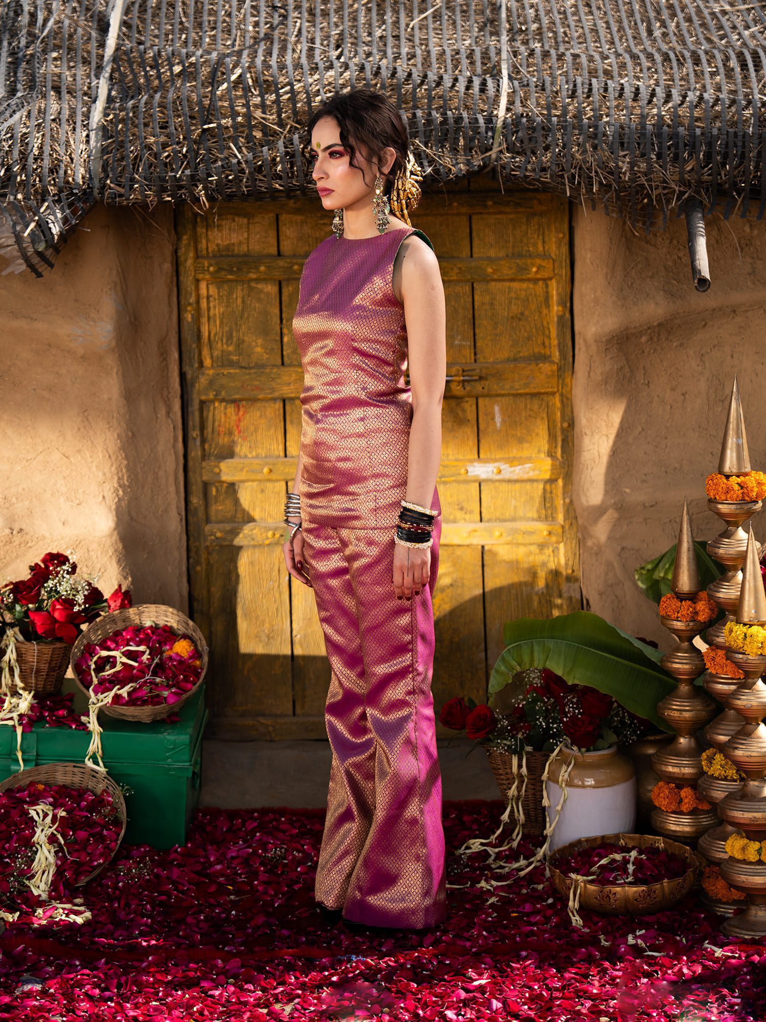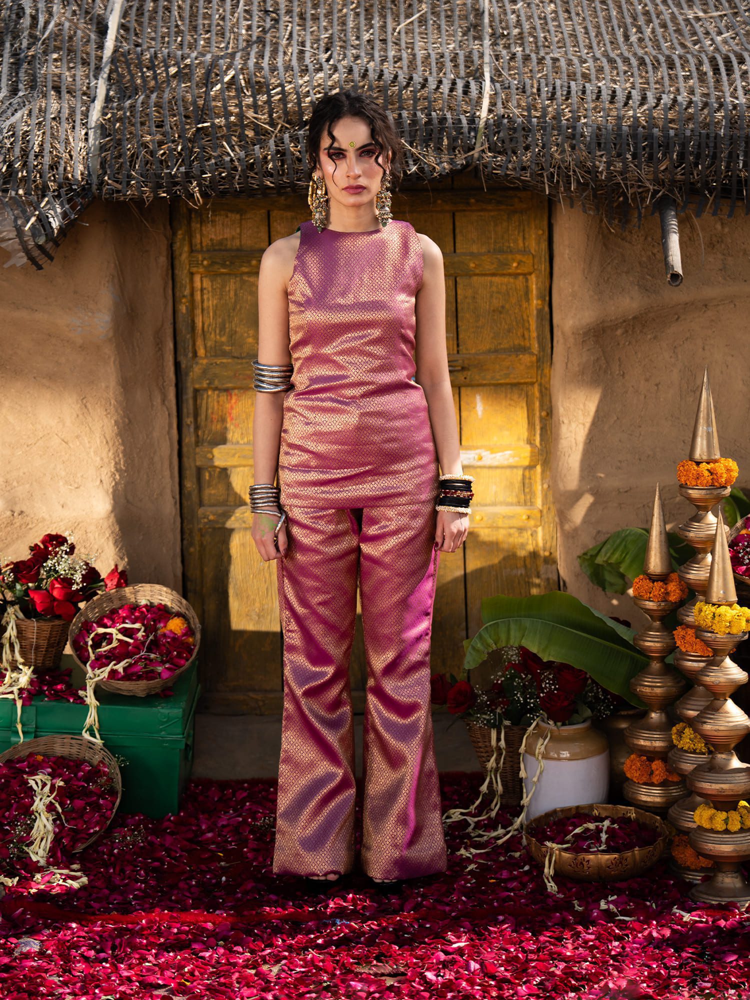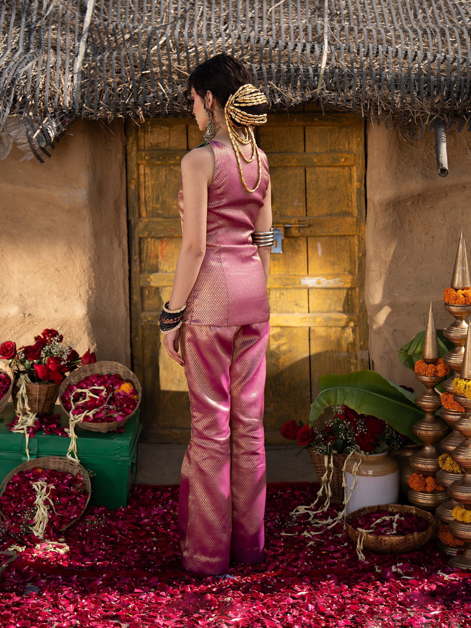 Effortlessly blend royal heritage with contemporary tailoring in this striking top. Designed to make a sophisticated statement, this top takes the opulent texture of traditional Indian brocade and reimagines it into a sleek, modern silhouette. It is the perfect, fuss-free choice for festive gatherings, intimate pre-wedding festivities, and elevated cultural events.