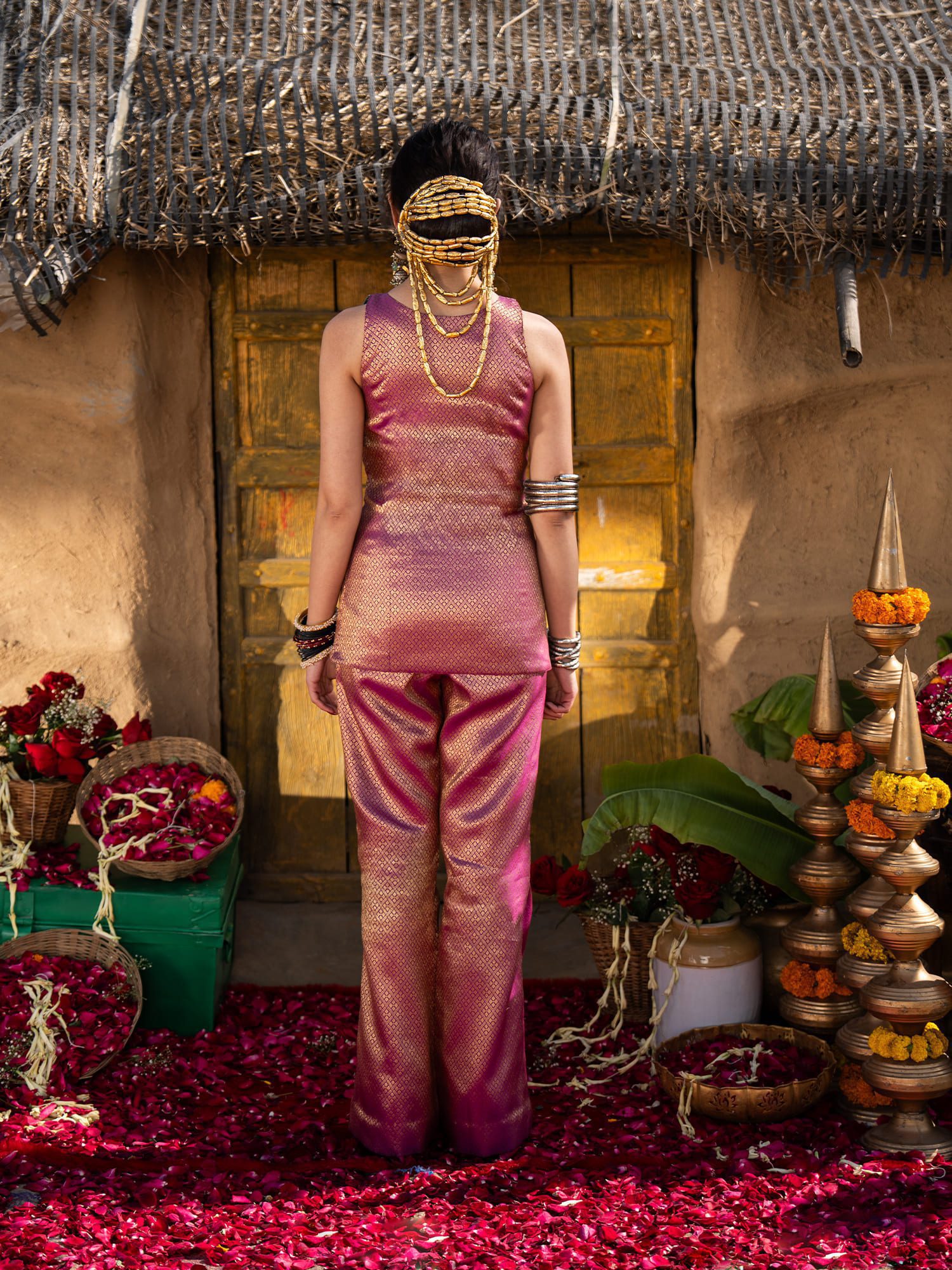 Styling Tip: Break up the warm gold tones by accessorizing with stacked, heavy oxidized silver bangles and oversized silver statement earrings—just like the rustic-chic styling in the image. Finish with a minimal bindi and sleek, pulled-back hair to keep the focus on the outfit’s sharp tailoring and rich texture.